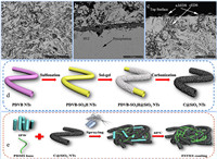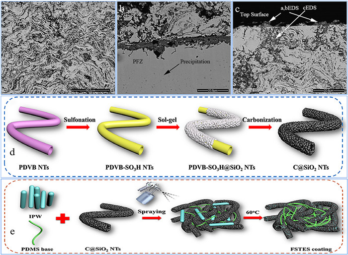 | Fig. 4. The addition of anti-corrosion coatings: (a) BSE-SEM image of coating microstructure of oxidized HVOF–NiCoCrAlYTa away from the top surface and interface with steel; (b, c) BSE-SEM image of material exposed to NaCl–KCl at 700 ℃ showing microstructure at coating/steel interface and penetration at the outer surface of the top coating. Reproduced with permission [69]. Copyright 2017, Nature. (d) Preparation schematic illustration of C@SiO2 NTs and (e) FSTES coating. Reproduced with permission [70]. Copyright 2022, Elsevier. | |
