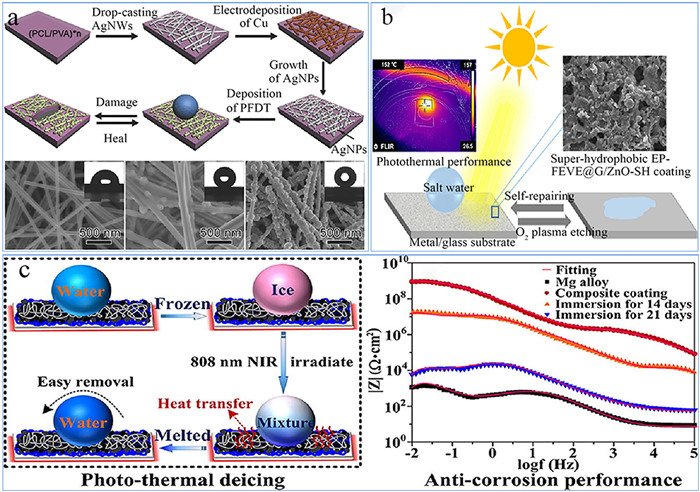 The exceptional effectiveness of superhydrophobic coatings in preventing metal corrosion has garnered significant interest. However, the practical use of these applications is still hindered by inadequate longevity and stability, as well as the intricate process of preparation. Then numerous researchers have investigated self-healing superhydrophobic surfaces. In addition, researchers have proposed strategies for adding self-healing polymers to superhydrophobic materials [71]. Under specific circumstances, materials with self-repairing capabilities can help restore damaged regions on super water-repellent surfaces [72]. Wu et al. prepared a conductive superhydrophobic film by depositing a thermally healable polycaprolactone (PCL)/poly(vinyl alcohol) (PVA) composite film with silver nanoparticles (AgNPs) and silver nanowires (AgNPs-AgNWs), and then depositing 1H,1H,2H,2H-perfluorodecanethiol (Fig. 5a) [73]. The layer of AgNPs-AgNWs not only provides hierarchical structures at both micron-scale and nano-scales to enhance superhydrophobicity, but it also could be heated at low voltage or low power NIR light exposure to heal the PCL/PVA film underneath.