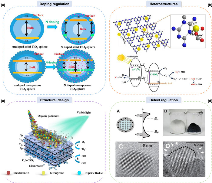 | Fig. 3. Various strategies to improve the photocatalytic performances of Ti-based nanomaterials. (a) Doping regulation. Reprinted with permission [77]. Copyright 2015, Elsevier. (b) Heterostructures. Reprinted with permission [85]. Copyright 2017, Elsevier. (c) Structural design. Reprinted with permission [59]. Copyright 2021, Elsevier. (d) Defect regulation. Reprinted with permission [92]. Copyright 2011, American Association for the Advancement of Science. | |