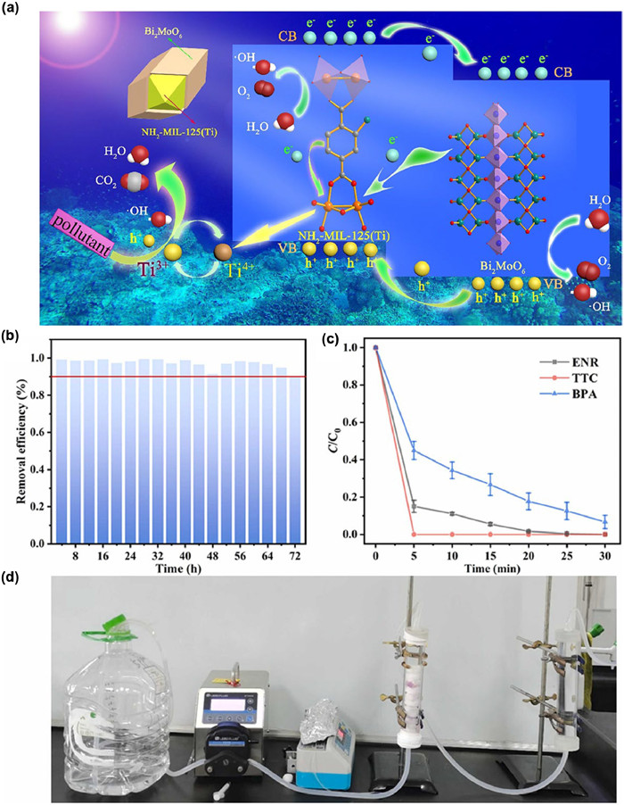 | Fig. 4. (a) Illustration of the visible light-driven photocatalytic mechanism of NH2-MIL-125(Ti)@Bi2MoO6 core-shell heterojunctions. Reproduced with permission [104]. Copyright 2019, Elsevier. (b) Long-term experiments on ATZ removal. (c) Degradation performance of different pollutants (e.g., tetracycline (TC), enrofloxacin (ENR) and bisphenol A (BPA)) in Co-H6chhc/PMS system. (d) Photograph of the fixed-bed device. Reaction conditions: ENR, TC, BPA = 10 mg/L, initial pH = 5.5, PMS = 0.4 mmol/L, Co-H6chhc = 300 mg/L. Reprinted with permission [105]. Copyright 2023, Elsevier. | |