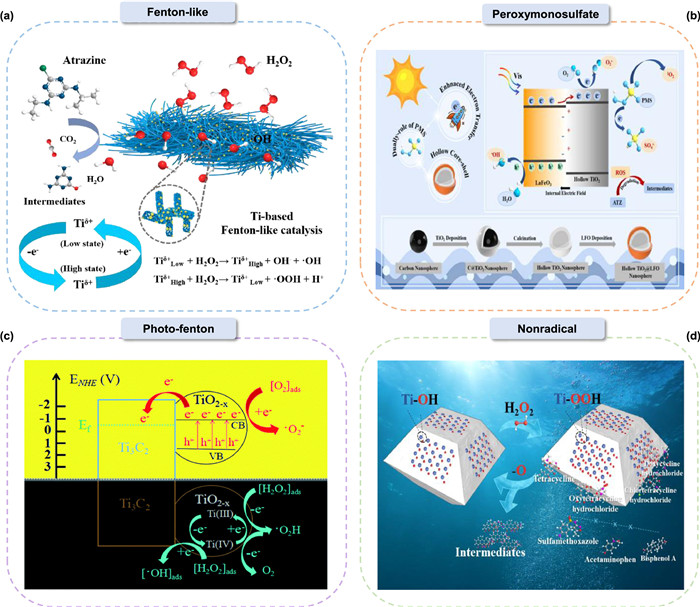 | Fig. 5. Ti-based Fenton-like processes. The H2O2-induced Fenton-like reactions (a) and peroxymonosulfate process (b). Reproduced with permission [114]. Copyright 2023, National Academy of Science. Reprinted with permission [118]. Copyright 2022, Elsevier. (c) Photo-Fenton catalysis. Reproduced with permission [65]. Copyright 2018, Royal Society of Chemistry. (d) Nonradical oxidation process. Reprinted with permission [119]. Copyright 2023, Elsevier. | |