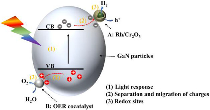 2. Fundamentals of GaN photocatalysisThere are various factors that affect the performance of particles photocatalyst for water splitting, including (1) light response, (2) separation and migration of charge carries, and (3) the presence of redox sites on the surface of photocatalysts, which all impact the efficiency of the photocatalytic hydrogen evolution reaction in varying degrees [39]. To improve photocatalytic performance, it is necessary to focus on enhancing light absorption, improving separation of charge carries, and facilitating hydrogen evolution reaction (HER) and oxygen evolution reaction (OER), respectively.