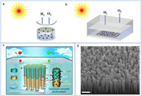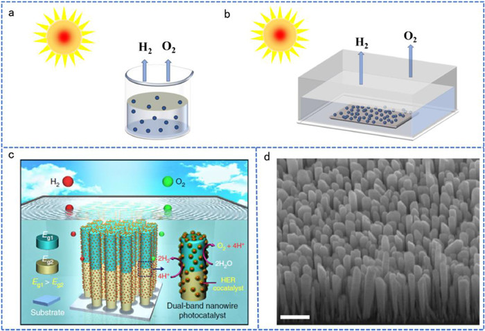 | Fig. 2. (a, b) Two types of semiconduction particles photocatalyst water splitting system. (c) The schematic illustration of a wafer-level GaN NWs photocatalytic overall water splitting system. Reproduced with permission [67]. Copyright 2018, Nature Publishing Group. (d) A 45° tilted field-emission SEM image of the GaN/InGaN NWs by MBE. Scale bar: 500 nm. Reproduced with permission [68]. Copyright 2023, Nature Publishing Group. | |