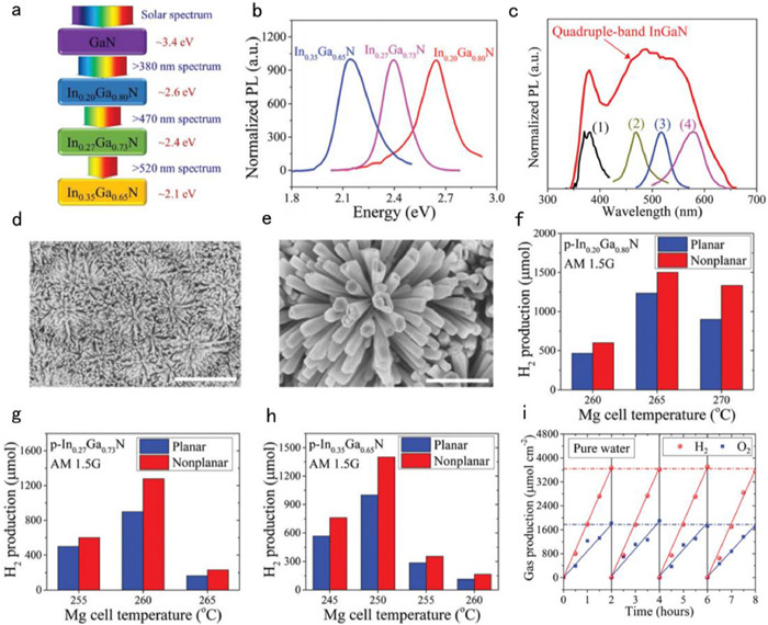 | Fig. 3. (a) Schematic illustration of light absorption on the quadruple-band InGaN stacks with varied indium compositions. (b, c) Room-temperature PL spectrum of single-band InGaN nanowires with varied indium compositions and quadruple-band InGaN nanowires. (1) GaN, (2) In0.20Ga0.80N, (3) In0.27Ga0.73N, and (4) In0.35Ga0.65N. (d, e) Top-view scanning electron microscopy (SEM) images of InGaN nanowire grown on nonplanar Si substrates. Scale bars: 5 mm and 1 mm. H2 gas production of single-band In0.20Ga0.80N (f), In0.27Ga0.73N (g), and In0.35Ga0.65N (h) nanowires at different Mg cell temperatures grown on Si substrates. (i) H2 and O2 gas generation measured in multiple cycles. Reproduced with permission [73]. Copyright 2018, Royal Society of Chemistry. | |