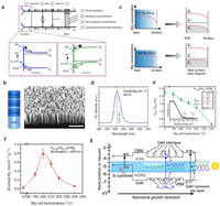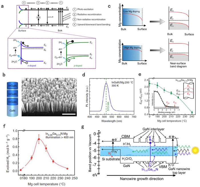 To construct p-type InGaN nanowire arrays, Kibria et al. grew vertically uniform In0.26Ga0.74N nanowire arrays on Si substrates by molecular beam epitaxy (MBE) using GaN nanowire templates. In Fig. 4b, a 45° titled SEM photograph demonstrates that In0.26Ga0.74N nanowires vertically aligned on Si substrate were fabricated successfully. The regulation and control of the energy band bending on the surface of InGaN can be achieved by doping with Mg2+. As shown in Fig. 4c, under the low concentration of Mg2+ doping, the surface region of the nanowire remains weakly n-type with large energy band bending, and with the increase of Mg2+ doping concentration, the near surface region becomes weakly p-type and therefore a smaller band bending. The room temperature PL spectra of InGaN NWs with ~26% indium composition in Fig. 4d clearly shows a single inter-band photoemission peak at ~513 nm corresponding to a bandgap of 2.42 eV [82].