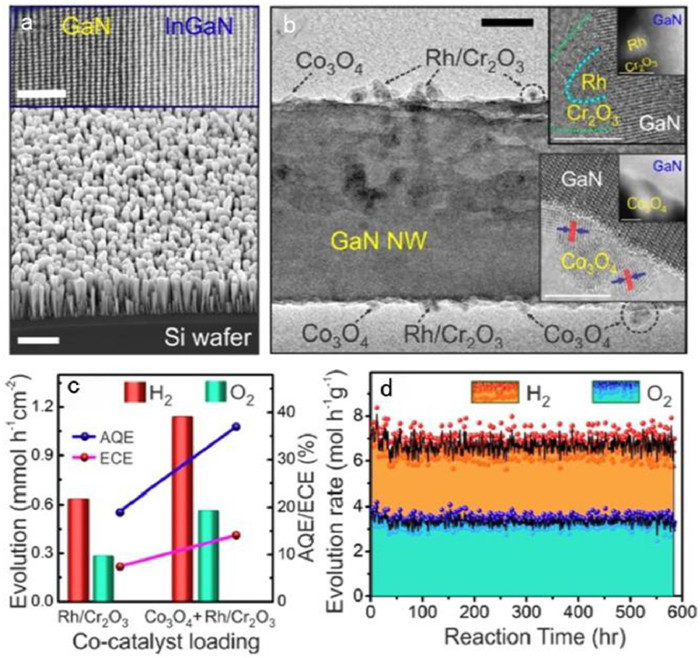 3.2.3. Loading dual-cocatalystsUse of multi-band InGaN/GaN nanowires can improve visible-light absorption. Fig. 5a shows the InGaN/GaN nanowire arrays on a Si wafer by MBE [85]. However, it is less efficient to directly split pure water due to the low activity and poor stability of single InGaN/GaN photocatalyst. In order to improve the activity and stability of photocatalyst, two cocatalysts are added. Core/shell-structured Rh/Cr2O3 NPs were prepared using two consecutive photoreduction methods under full arc illumination 300 W Xenon lamp, and were employed as a cocatalyst for the proton reduction in water splitting. Co3O4 was prepared by photooxidation deposition in 0.01 mol/L potassium iodate (KIO3) aqueous solution as the cocatalyst for water oxidation. Fig. 5b shows the GaN nanowire modified with Co3O4 and Rh/Cr2O3. Additionally, since water molecules can effectively adsorb and detach on GaN and Co3O4 surfaces, the stability of the photocatalyst and the lifetime of the artificial photosynthetic system are improved [86]. The water splitting reaction under the cocatalysts of Co3O4 and Rh/Cr2O3 exhibits significantly higher evolution rates of H2 and O2 compared to single Rh/Cr2O3, and the ratio of H2 and O2 evolution rates remains at about 2:1 [87-89]. The STH conversion efficiency of overall pure water splitting obtained by solar hydrogen production formula under the action of double cocatalyst is ~2.7%. The apparent quantum efficiency (AQE) of nanowires loaded with double cocatalyst is increased to ~37% in the wavelength range of 200–490 nm under the full arc illumination of AM1.5G filter [90]. The corresponding energy conversion efficiency (ECE) is ~14%, as shown in Fig. 5c. It can be seen from Fig. 5d, after 584 h of pure water splitting reaction, the evolution rates of H2 and O2 did not decrease significantly with the increase of reaction time [91]. It is not difficult to conclude that GaN NWs photocatalyst modified with double cocatalysts have high activity and long-term stability for its industrial application.