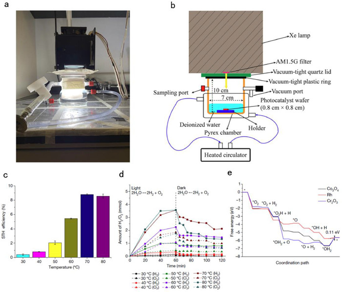 | Fig. 6. (a) Temperature-controllable photocatalytic OWS system. (b) Schematic illustration of the temperature-controllable photocatalytic OWS system. (c) Temperature-dependent STH efficiency of the GaN/InGaN NWs modified with Rh/Cr2O3 and Co3O4. (d) Temperature-dependent hydrogen–oxygen recombination reaction. (e) Free-energy profile of hydrogen–oxygen recombination on the cocatalyst Co3O4, Rh and Cr2O3. Reproduced with permission [65]. Copyright 2023, Nature Publishing Group. | |