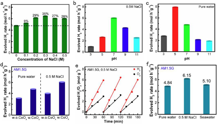 After the oxidation of Cl−, additional H+ and O2 can be produced, increasing the hydrogen/oxygen production of seawater splitting [119]. Hydrogen evolution of NaCl aqueous solutions has been significantly enhanced (Fig. 7a). Compared with pure water, the hydrogen production efficiency of NaCl aqueous solutions with neutral pH is higher, as shown in Fig. 7b, which is in accordance with the result of NaCl industrial electrolysis. It can be seen from Fig. 7c that pure water splitting got better performance at pH ~5, which is similar to the conclusion reported by Domen et al. under alkaline conditions, N3− ions are easily oxidized and consumes on the surface of the photocatalyst, resulting in low photoactivity.