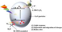 | Fig. 1. A proposed reaction mechanism of water splitting on GaN particles photocatalyst modified with dual-cocatalysts under the visible light. | |