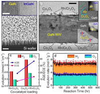 | Fig. 5. (a) SEM image of GaN/InGaN nanowire arrays on a Si wafer. Scale bar, 500 nm. High-resolution transmission electron microscopy (HRSTEM) image from a InGaN/GaN interface. Scale bar, 5 nm. (b) TEM image of GaN/InGaN nanowire modified with Rh/Cr2O3 and Co3O4. Scale bar, 20 nm. The inset shows Scanning transmission electron microscopy bright field (STEM-BF) and Scanning transmission electron microscopy high-angle annular dark field (STEM-HAADF) images of Rh/Cr2O3 (scale bars, 5 nm) and Co3O4 nanostructures (scale bar, 5 nm and 2 nm). (c) Evolution rates of H2 and O2 in pure water splitting on single- and dual-cocatalyst loading GaN/InGaN NWs. (d) Average evolution rate of H2 and O2 from each cycle during a long-term repeated course of water splitting under concentrated sunlight. Reproduced with permission [85]. Copyright 2018, American Chemical Society. | |