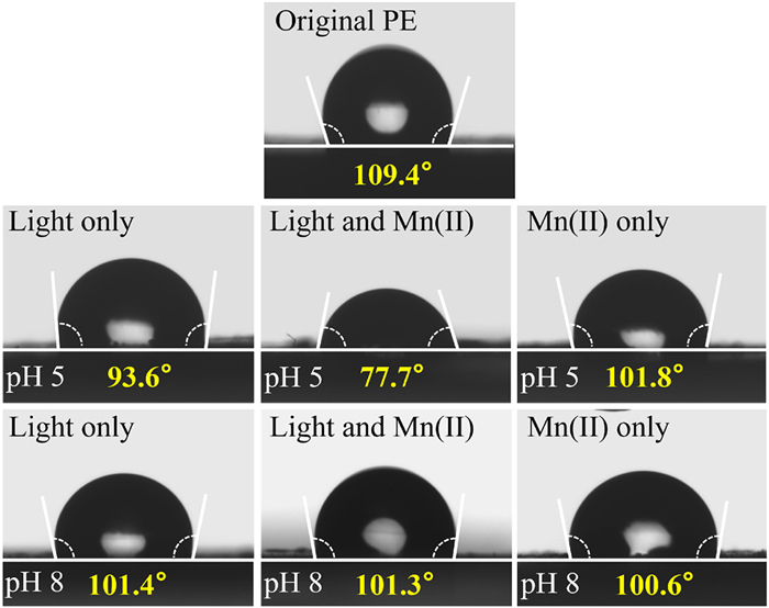 PE is a highly hydrophobic and non-polar polymer with a density lower than that of water. During various aging treatments, PE particles floated on the liquid surface, forming a distinct interface with an aqueous phase. With progressive aging, the interface between the aged PE and the aqueous phase began to diffuse, indicating a change in the hydrophobicity of the aged PE [11]. The contact angle of the original PE particles is ~109.4°, as shown in Fig. 1. After 720-day (720-d) aging, these particles are suspended in an aqueous phase and re-layered within a few minutes. The contact angle of the aged PE particles was pronouncedly decreased to 77.7° with the presence of Mn(Ⅱ) and natural light exposure at pH 5. The contact angles of aged PE particles with Mn(Ⅱ) and light were 93.6° and 101.8°, respectively, indicating that both treatments contribute to the hydrophilic tendencies in the aged PE.