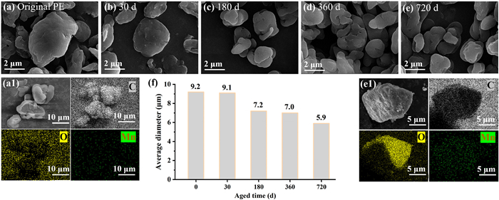 | Fig. 2. SEM images of original PE particles (a) and the PE particles after aging with the presence of Mn(Ⅱ) and natural light exposure at pH 5 (b–e). Elemental mapping images of original PE particles (a1) and the PE particles after 720 d of aging (e1). Histogram of particle size (diameter) of original and aged PE particles (f). | |
