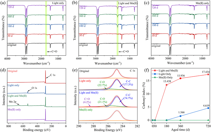 | Fig. 3. ATR-FTIR set of spectra for PE particles after different aging treatment (a–c). XPS survey (d), the high-resolution XPS spectra of C 1s (e) on original and aging PE particles. The trends in the CI of different treatment (f). All reactions were conducted at pH 5. | |