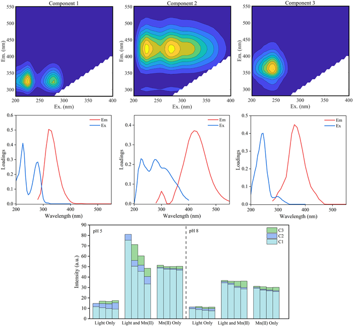 The total organic carbon (TOC) content of PE solutions under various aging treatments was tested to understand the variation in the content of non-fluorescent DOM (Fig. S5 in Supporting information). In the control group protected from light, TOC remains below the detection threshold of an instrument, illustrating that light is necessary for PE dissolution. Under natural light, the addition of Mn(Ⅱ) in the solution remarkably increases the TOC. During the synergistic treatment of light and Mn(Ⅱ), the increasing TOC in solution indicates a trend of first slow and then fast speed, and the reason for this is that aging MPs exhibit a relatively large irradiated area. The role of Mn(Ⅱ) in this reaction needs to be further explored.