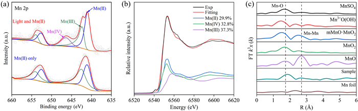 | Fig. 5. (a) XPS spectra of Mn 2p on original and aging PE particles. (b) Normalized Mn edge XANES spectra of PE particles aging with the presence of Mn(Ⅱ) and natural light exposure at pH 5. (c) Mn K-edge FT-EXAFS spectra for aging PE particles. | |