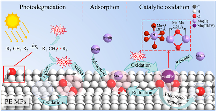 Microplastics (MPs) are emerging environmental pollutants that are difficult to degrade naturally due to their stable chemical properties and exist in the environment for a long time [1,2]. Previous works show that plastics have infiltrated some of the planet's most remote and pristine areas, emphasizing the urgent need to reduce their impact [3,4]. MPs are acknowledged to promote the diffusion and ecological implications of pollutants, and the understanding of their involvement in these processes has received increasing scholarly attention [5,6]. Notably, approximately 85% of MPs enter water, and aquatic circumstances become the largest storage repository of these substances [3,7]. In aquatic circumstances, a potential interaction exists between quantitative manganese (Mn) in water and MPs. However, research on the impact of Mn on MP aging is still limited, especially that of aquatic Mn(Ⅱ). Classifying this process is crucial to understand their long-term behavior and ecological impact.