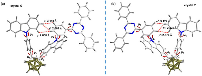 The single crystal X-ray diffraction analysis for Trz-mCzCbCz was performed. The crystal structures including packing structure diagrams, crystallographic data, and selected chemical bonds and dihedral angle data are shown in Fig. 1, Table 1, Tables S1-S3 and Figs. S3-S5 (Supporting information). Interestingly, two types of crystals of Trz-mCzCbCz were obtained, which grew from the mixed solvents of DCM/MeOH showing green (G) and yellow (Y) emissions. During the crystal growth, crystal G appeared first, which could become yellow emission by heating or grinding, thus crystals G and Y should be kinetic and thermodynamic products, respectively. Both crystals G and Y exhibit a V-type shape. No obvious differences for the selected angles φ1-φ5 and the C1–C2 bond lengths were observed (Tables S2 and S3 in Supporting information), and the packing diagrams of crystals G and Y are mirror-symmetric (Fig. 1). The dihedral angles between the Cz1 and Trz (φ6) for crystals G and Y are 42.5° and 41.7°, respectively, which leads to an edge-to-face alignment of the D/A counterpart. In addition, three intramolecular C–H···H–C interactions between D and A units are observed for both crystals (Figs. 1a and b), which is beneficial for the efficient TSCT process. Moreover, the bonding distance between C–H···H–C interactions, for instance γ and γ' is 0.082 Å, which may be the reason for the emissive difference between crystals G and Y.