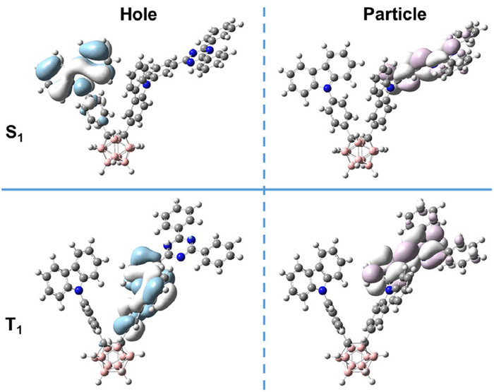 To gain insight into the electronic structure of Trz-mCzCbCz, density function theory (DFT) and time-dependent DFT (TD-DFT) simulations were carried out. For the S1 state, the “hole” is distributed on the Cz1 and the adjacent phenylene, while the “particle” is located on the Trz unit (Fig. 2). The calculation predicts the TSCT process of Trz-mCzCbCz in the excited state. The energy levels of S1 and T1 states are 2.73 eV and 2.56 eV, respectively. Therefore the calculated ΔEST is 0.17 eV, indicating that an efficient RISC process could occur between S1 and T1.