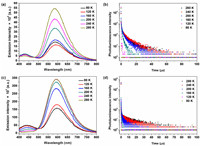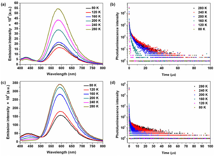 | Fig. 4. (a) Temperature-dependent PL spectra of mCP doped-film. (b) Transient PL decay curves of mCP doped-film. (c) Temperature-dependent PL spectra of DBFPO doped-film. (d) Transient PL decay curves of DBFPO doped-film. | |