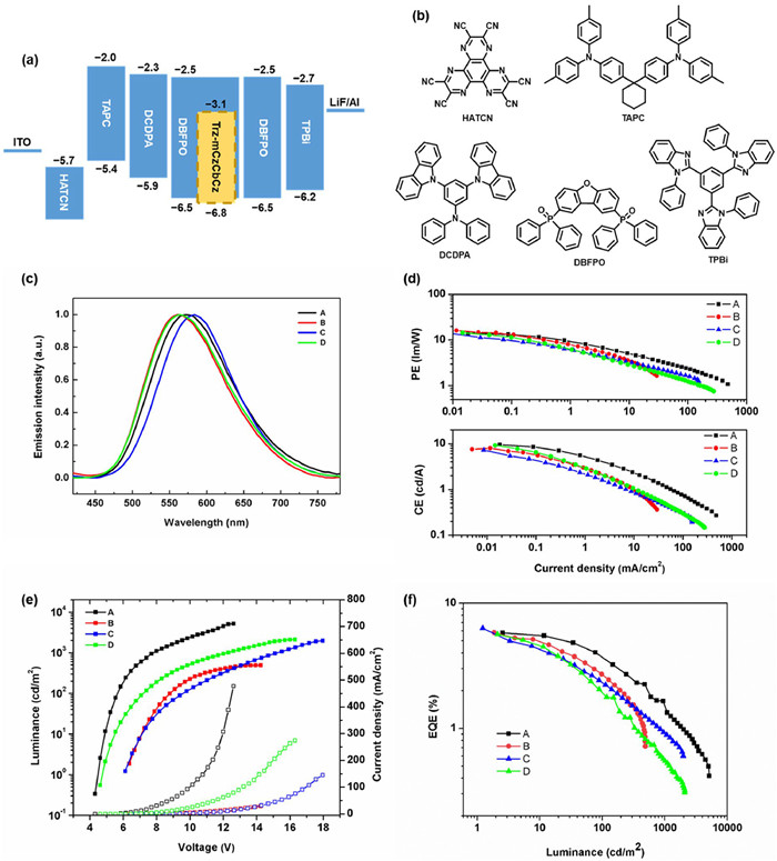| Fig. 5. (a) Schematic diagram and energy level of devices A-D. (b) Molecular structures of the compounds used in the devices. (c) Normalized EL spectra at 10 V of these devices. (d) Power efficiency (PE), current efficiency (CE) versus luminance of these devices. (e) Luminance–voltage-current density (L-V-J) curves. (f) EQE versus luminance of these devices. | |
