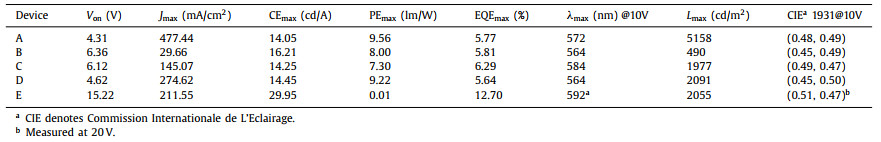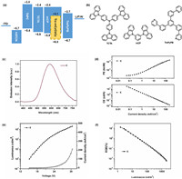 | Fig. 6. (a) Schematic diagram and energy level of device E. (b) Molecular structures of the compounds used in the device E. (c) Normalized EL spectrum at 20 V of device E. (d) PE, CE versus luminance of device E. (e) L-V-J curves of device E. (f) EQE versus luminance of device E. | |
