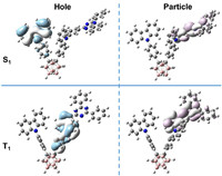 Organic light-emitting materials have attracted huge attention because of their promising applications in future lighting, displays and medicine [1-4]. Recently, thermally activated delayed fluorescence (TADF) molecules which can harvest both singlet and triplet excitons become the focus in science and industry [5-9]. For the TADF mechanism, the ambient thermal energy is instrumental in promoting efficient reverse intersystem crossing (RISC) from the triplet (T1) to the singlet (S1) excited states. This process is facilitated by the small energy gap (ΔEST) between these states, typically <0.25 eV, which is conducive to an effective RISC process. The RISC process generally unfolds on the microsecond (µs) scale [10]. Since this foundational discovery, TADF-active materials have been extensively developed and optimized, which further significantly improve organic light-emitting diodes (OLED) performances [11-13]. The mechanisms underlying TADF are primarily categorized into through-bond charge transfer (TBCT) and through-space charge transfer (TSCT), which are pivotal for the practical implementation of TADF in various applications.