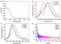 | Fig. 3. (a) UV–vis spectrum of Trz-mCzCbCz at room temperature in neat film. (b) The fluorescence and phosphorescence spectra of Trz-mCzCbCz in dilute toluene (10−5 mol/L). (c) The photoluminescence spectra of Trz-mCzCbCz in aggregate states. (d) Transient PL spectra of Trz-mCzCbCz at room temperature. | |