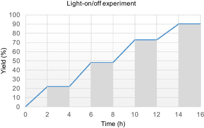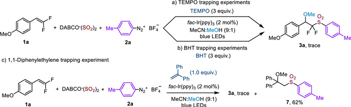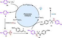 To gain mechanistic insights into this photoredox-catalyzed synthesis of α,α-difluoromethyl sulfones from sulfur dioxide, several control experiments were conducted, as shown in Scheme 5. The reaction was completely suppressed when the radical scavenger 2,2,6,6-tetramethylpiperidinooxy (TEMPO) or butylated hydroxytoluene (BHT) was added under the standard conditions (Schemes 5a and b). When 1,1-diphenylethylene was added to the standard conditions, trace amount of 3a was detected along with 62% yield of radical addition product 7 (Scheme 5c). These results confirmed that the arylsulfonyl radical was generated during this transformation. Furthermore, light-on/off experiment was conducted and the results indicated that this reaction was exclusive light dependence (Fig. 1).
