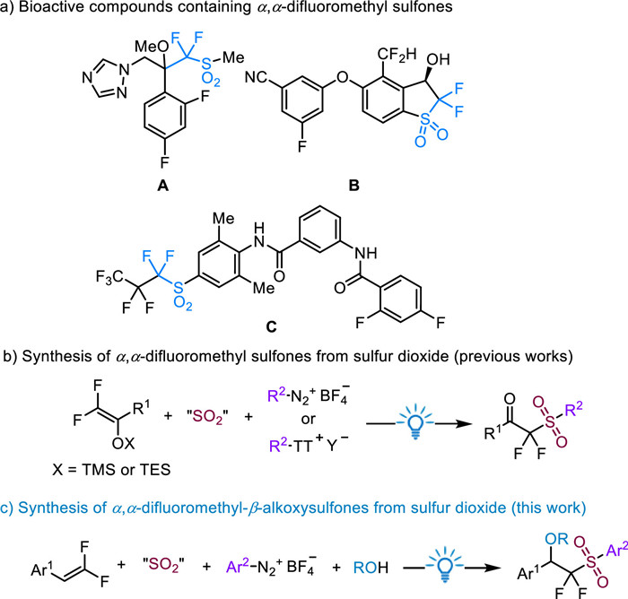 Sulfonyl groups are privileged building blocks in pharmaceuticals and natural products [1,2]. Among them, organic sulfones possessing difluoromethyl moiety have drawn condiserable interest due to the presence of this moiety in broad bioactive compounds (Scheme 1a). For instance, compound A exhibits potent antifungal activity against Candida albicans in vivo [3]. Compounds B is demonstrated as hypoxia inducible factor 2α (HIF-2α) inhibitors [4]. Compounds C is able to control animal parasites [5]. With such a plethora of bioactivities, protocols addressing the rapid preparation of α,α-difluoromethyl sulfones have attracted great attention in the past few years. Strategies for the synthesis of α,α-difluoromethyl sulfones with various fluoroalkylation reagents have been developed [6-22]. However, there are few reports for the direct preparation of α,α-difluoromethyl sulfones without fluoroalkylation reagents.