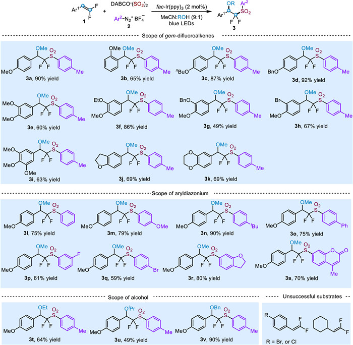 | Scheme 2. Substrate Scope for the synthesis of α,α-difluoromethyl-β-alkoxysulfones. Conditions: gem–difluoroalkenes 1 (0.2 mmol), DABCO·(SO2)2 (0.2 mmol), aryldiazonium tetrafluoroborate 2 (0.3 mmol), fac-Ir(ppy)3 (0.004 mmol, 0.02 equiv.), MeCN:MeOH (9:1) (2.0 mL), r.t., 24 h, blue LEDs, under N2 atmosphere. Isolated yield based on gem–difluoroalkenes 1. | |