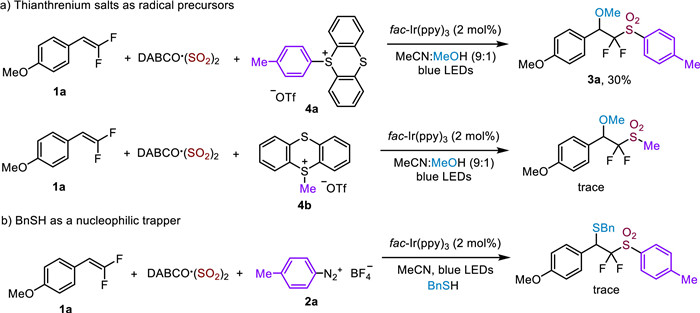 Recently, thianthrenium salts have been developed as valuable radical precursors for various photoredox-catalyzed reactions [89-97]. Thus, we also examined thianthrenium salts as radical precursors in this reaction. To our delight, the desired product 3a was successfully furnished, though with only 30% yield (Scheme 3a). However, the alkyl substituted thianthrenium salt 4b could not provide the desired product (Scheme 3a). Furthermore, the benzyl mercaptane as a nucleophilic trapper was also examined in this reaction. Unfortunately, the corresponding product could not be furnished (Scheme 3b).