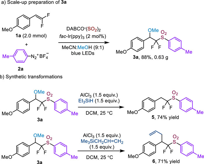 To verify the practicability of this photoredox-catalyzed synthesis of α,α-difluoromethyl sulfones from sulfur dioxide, a scale-up (2.0 mmol) experiment was performed. Gratifyingly, a similar result was smoothly afforded (Scheme 4a). To examine the utility of the obtained α,α-difluoromethyl sulfones, some synthetic transformations were realized (Scheme 4b). First, the methoxyl group of 3a could be readily removed with triethylsilyl hydride in the presence of aluminum chloride, furnishing product 5 in 74% yield. Furthermore, the methoxyl group could also be replaced by allyl moiety with allylsilane and aluminum chloride, delivering the α,α-difluoromethyl β-allylsulfones 6 in good yields.