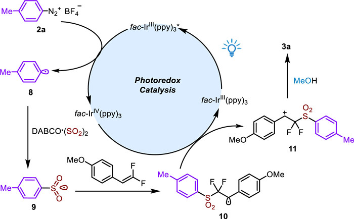 On the basis of control experiments and previous studies, a possible mechanism for this photoredox-catalyzed α,α-difluoromethyl sulfones from sulfur dioxide is outlined in Scheme 6. Initially, the excitation of fac-Ir(ppy)3 under visible light irradiation produced the excited state of fac-Ir(ppy)3*, which reduced aryldiazonium tetrafluoroborate 2a to aryl radical 8 along with oxidized fac-IrIV(ppy)3. Subsequently, the aryl radical 8 was trapped by sulfur dioxide from DABCO·(SO2)2 to furnish an arylsulfonyl radical 9, which added to the double bond of gem–difluoroalkenes to form difluoromethylated radical 10. Then, the radical intermediate 10 would be oxidized by fac-IrIV(ppy)3, leading to carbocation intermediate 11 along with the regeneration of fac-Ir(ppy)3. Finally, the carbocation 11 would react with a nucleophilic methanol to give the final product 3a.