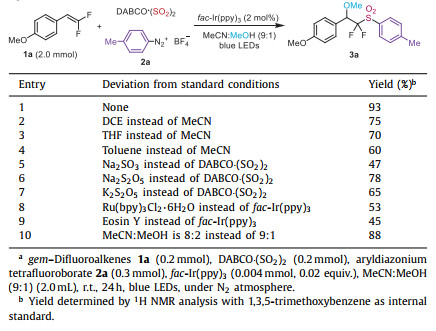 We started our investigations by evaluating the four-component reaction of 1-(2,2-difluorovinyl)−4-methoxybenzene 1a, p-methylphenyldiazonium tetrafluoroborate 2a, DABCO·(SO2)2 and methanol. Initially, this reaction was performed in MeCN with fac-Ir(ppy)3 as the photocatalyst under the irradiation of blue LEDs at room temperature. To our delight, high efficiency of this transformation was observed, and the corresponding α,α-difluoromethyl sulfone 3a was afforded in 93% NMR yield (Table 1, entry 1). Lower yields were obtained when the reactions were performed in DCE, THF and toluene (Table 1, entries 2–4). Other sulfur dioxide surrogates, such as Na2SO3, Na2S2O5 and K2S2O5 gave inferior results (Table 1, entries 5–7). Examination of different photocatalyst showed lower yields (Table 1, entries 8 and 9). No higher yield was observed when the reaction was carried out in MeCN:MeOH (8:2) (Table 1, entry 10).