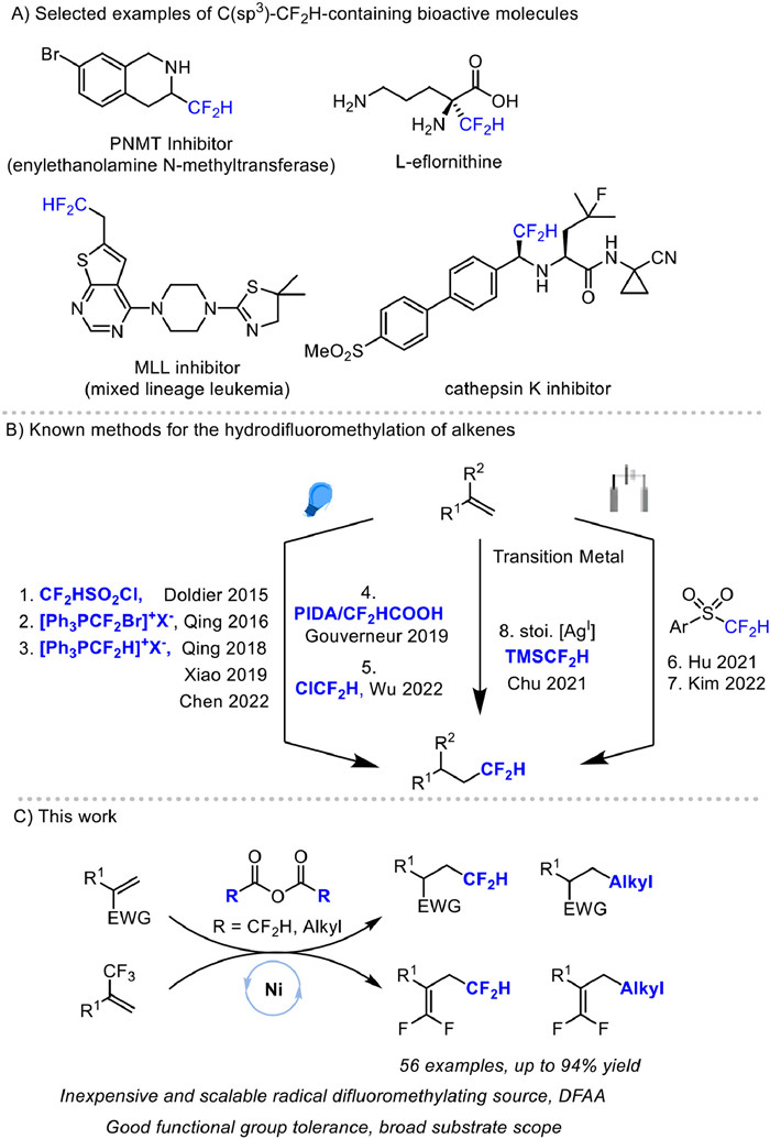 Transition metal-catalyzed difluoromethylation reaction has been established during the last few years [43-52]. Nevertheless, transition metal-catalyzed hydrodifluoromethylation of alkenes have been seldom reported. More recently, Chu developed a silver-enabled difluoromethylation reaction of alkenes with TMSCF2H, thus improving the practicability of such reactions (Scheme 1B, 8) [53]. However, the use of chemical equivalent silver reagent does increase its cost.