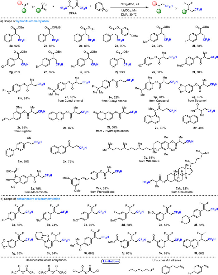 In conclusion, we have developed a nickel-catalyzed decarboxylative reductive difluoromethylation reaction of alkenes using cost-efficient and practical DFAA/pyridine N-oxide reagents system for the first time. This reaction exhibits broad substrate scopes and good functional group tolerance. A wide range of C(sp3)-CF2H containing compounds were synthesized under mild condition. In addition, various gem–difluoroalkenes bearing CF2H group were also prepared using this new established strategy. Difluoroacetic anhydride has been then extended to other common alkyl anhydrides, and the corresponding hydroalkylation and defluoroalkylation processes have also been successfully achieved.