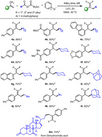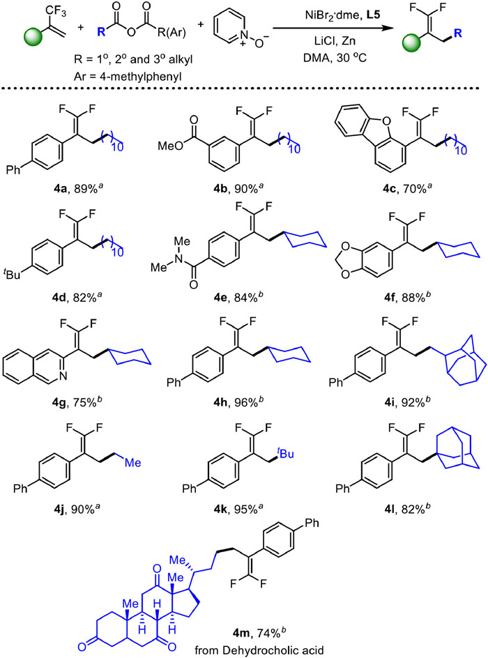 During the past few years, nickel-catalyzed allylic defluorinative alkylation of trifluoromethyl alkenes have been well developed [68-72]. Among them, in 2019, Fu's group reported an efficient synthesis of gem–difluoroalkenes through a decarboxylation process of redox-active esters [73]. Inspired by this work, we envisioned that this acid anhydride/pyridine N-oxide system could also be applied to the defluorinative alkylation reaction as an alkyl radical precursor. Under the above newly established standard conditions, the alkylation product 4a was only isolated in 56% yield with a low conversion efficiency. Satisfyingly, a significant increase of yield was observed when the Mn was replaced with Zn. We then gratifyingly found that the diverse aryl and heteroaryl substituted trifluoromethyl alkenes underwent this nickel-catalyzed defluorinative alkylation under the modified conditions, rendering the corresponding products 4a–4g with good efficiency and functional group tolerance. Primary, secondary and tertiary acid anhydrides (or in-situ mixed acid anhydride) were all well tolerated, providing the gem–difluoroalkene products 4h–4l in good to excellent yields. Dehydrocholic acid mixed anhydride also worked well as an example of LSF of complex molecule, giving the desired product 4m in 74% isolated yield (Scheme 3).