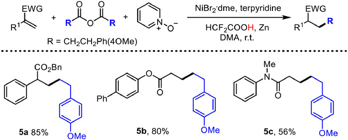 | Scheme 4. Nickel-catalyzed hydroalkylation of electron‐deficient alkenes using alkyl acid anhydride. Reaction conditions: alkene (0.2 mmol), alkyl acid anhydride (0.3 mmol), pyridine N-oxide (0.3 mmol), HCF2COOH (1.2 mmol), Zn (0.6 mmol), NiBr2·dme (10 mol%), L5 (15 mol%), DMA (0.1 mol/L), N2, r.t., 20 h, isolated yields. | |