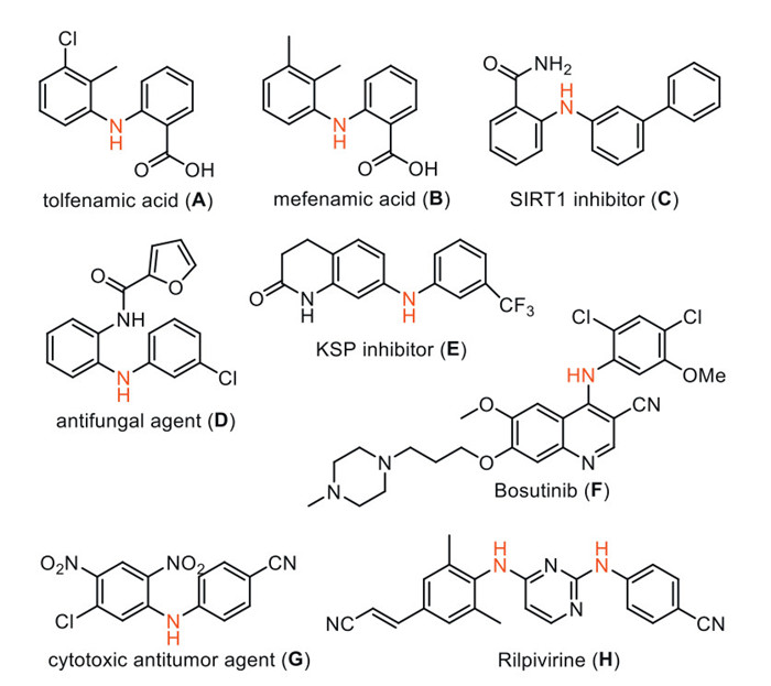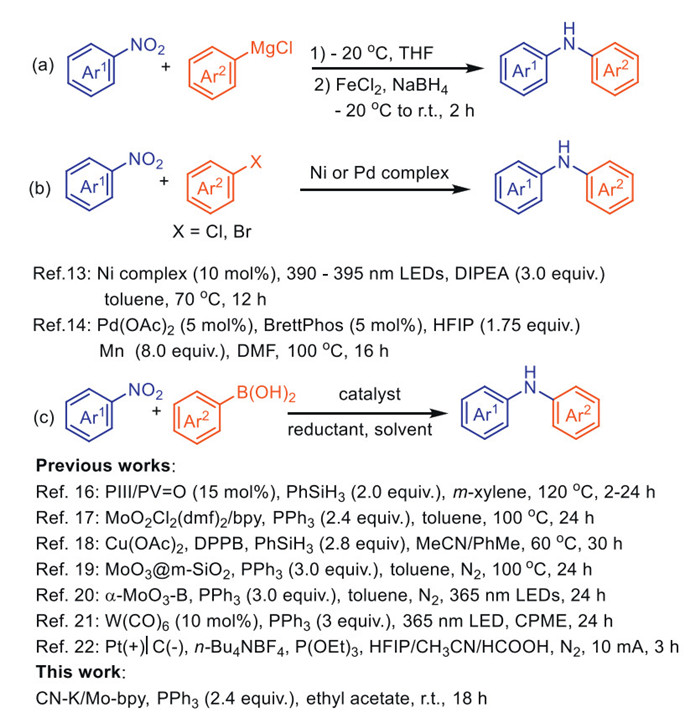 Amine as raw material is one of the fastest growing sectors in the global chemical and pharmaceutical industries. Among them, diarylamine is the most important structural unit in various natural products and drug molecules, such as tolfenamic acid (A) with antibacterial activity, mefenamic acid (B) with antibacterial activity [1], SIRT1 inhibitor (C) [2], antifungal agent (D) [3], KSP inhibitor (E) [4], Bosutinib (F) as an orally active Src and Abl kinase inhibitor [5], cytotoxic antitumor agent (G) [6], and Rilpivirine (H) as a new non-nucleoside reverse transcriptase inhibitor [7] (Fig. 1). They are also widely used in the fields of agrochemical industries, dyes, electronic industries and functional materials. Accordingly, synthetic approaches for diarylamines have received increasing attention. Traditionally, the strategies for the preparation of diarylamines include Buchwald–Hartwig amination of aryl halides [8], Ullmann type C—N cross-coupling reaction [9], Chan–Lam–Evans couplings [10], and reductive amination [11]. These amination processes employ aryl amines as nitrogen sources, which are usually prepared by reducing nitroarenes. Compared with aryl amines, the direct use of nitroarene as the coupling partner not only improves the economy of steps and saves time, but also allows tolerance to unprotected amines. Consequently, there are some reports about the synthesis of diarylamine from nitroaromatic compounds.