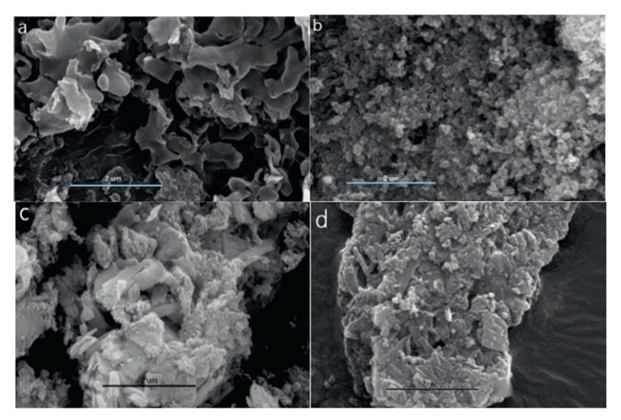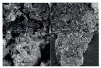 | Fig. 3. SEM images of CN-K (a), Mo-Bpy (b) and CN-K/Mo-Bpy (c, fresh) and CN-K/Mo-Bpy (d, recovered). | |