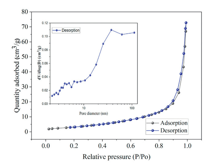 The porous properties and specific surface area of CN-K and CN-K/Mo-Bpy were characterized by BET and Barrett-Joyner-Halenda (BJH) methods (Fig. 4). The specific surface area of CN-K/MoO2Cl2-Bpy was calculated to be 4.70 cm2/g, which is slight lower than of CN-K (5.79 cm2/g).