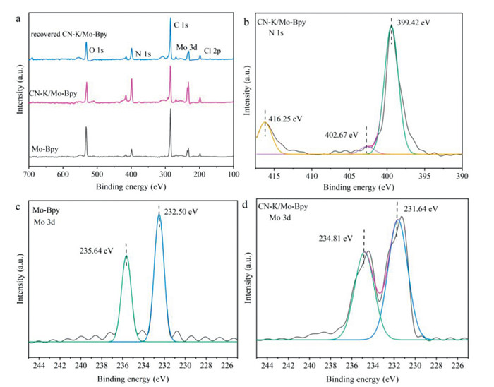 | Fig. 5. The XPS spectra of CN-K/Mo-Bpy: wide scan (a), high-resolution spectrum for the N 1s (b), Mo 3d (c, Mo-Bpy) and Mo 3d (d, CN-K/Mo-Bpy). | |