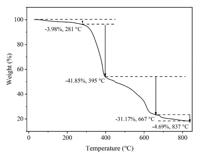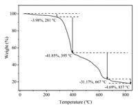 To investigate the stability and thermal behavior of CN-K/Mo-Bpy, thermogravimetric analysis (TGA) was measured at a heating rate of 10 ℃/min under a nitrogen atmosphere (Fig. 7). The TGA curve shows that the thermal decomposition temperature of CN-K/Mo-Bpy was around 280 ℃, which indicates that CN-K/Mo-Bpy has good thermal stability.