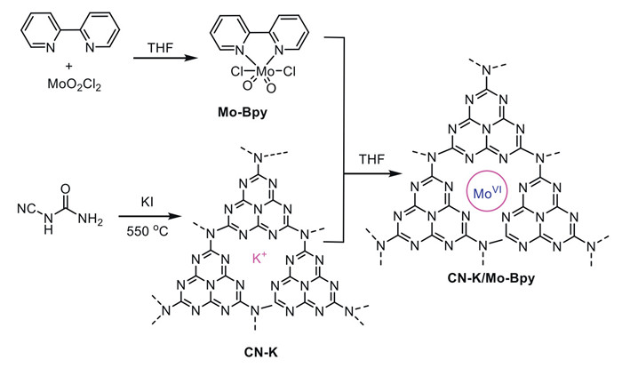 The synthesizing process of CN-K/Mo-Bpy was shown in Scheme 2. The complex Mo-Bpy was prepared by the standard method of replacing the THF molecules in the solvent adduct MoO2Cl2(THF)2 by 2, 2′-bipyridine ligand. CN-K material was prepared by direct thermal polymerization of dicyandiamide with the addition of potassium iodide [52]. The CN-K/Mo-Bpy catalyst was prepared by cation exchange of K+ in CN-K by Mo-Bpy in THF for 3 days at room temperature [53].