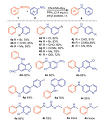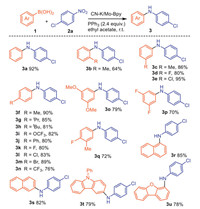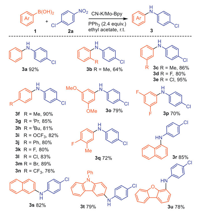 | Scheme 3. Substrate scope for (hetero)aryl boronic acids. Reaction conditions: nitroarene (1.0 mmol), arylboronic acid (1.5 mmol), PPh3 (2.4 mmol), CN-K/Mo-Bpy (40 mg), ethyl acetate (3 mL) at room temperature for 18 h, isolated yields based on 2. | |
