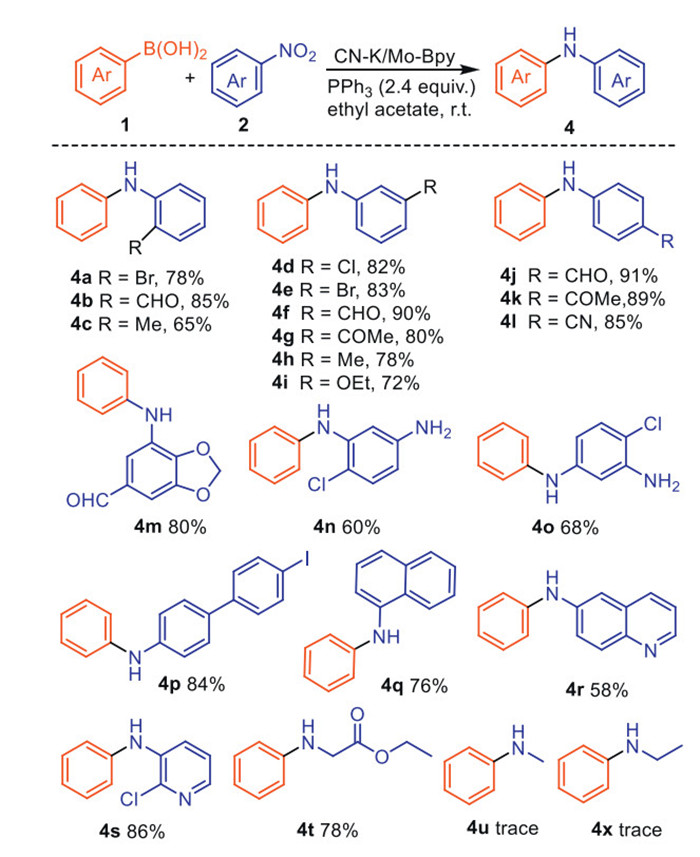 In conclusion, a heterogeneous catalyst (CN-K/Mo-Bpy) employing Mo anchored on C3N4 with 2, 2′-bipyridine ligand was developed and characterized. The designed CN-K/Mo-Bpy exhibits high catalytic activity with the use of affordable PPh3 as reductant for synthesis of (hetero)aryl amines from commercially available nitroarenes in a single synthetic operation. This protocol is rather practical as no special equipment is required, and ambient temperature is sufficient to achieve high to excellent yield of the secondary aromatic amines with wide substrate scope and excellent functional-group compatibility. Additionally, the potential of our method is further demonstrated by the late-stage modifications of bioactive molecules and the gram scale synthesis. The heterogeneous nature of the reaction system enables the catalyst to be recovered and reused for five times without obvious loss of its catalytic activity. Continuous research on organic synthesis using heterogeneous catalysts in our group is ongoing and will be reported in due course.