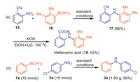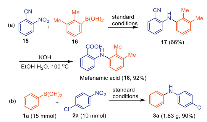 Another synthetic utility of our protocol is the synthesis of mefenamic acid, a non-steroidal anti-inflammatory drug. It could be obtained by the reaction of 2-cyanonitrobenzene (15) with 2,3-dimethylphenylboronic acid (16) after hydrolysis of the cyano group, with an overall yield of 59% (Scheme 6a). Collectively, this method demonstrated the potential utility of synthesizing drug-related compounds. In addition, the reaction protocol was amendable to a preparative scale synthesis. The model reaction based on 10 mmol of 1-chloro-4-nitrobenzene was carried out under the standard condition, giving the desired product 3a in an amount of 1.83 g (90% yield) (Scheme 6b).