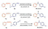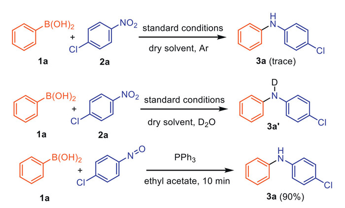 Several control experiments were performed to gain insight into the mechanism (Scheme 7). When the model reaction was performed in dry ethyl acetate under an inert atmosphere, it was found that only a trace amount of desired product 3a was detected. Meanwhile, when deuterated water was added, deuterated product 3aʹ was formed. These results indicated that water is crucial for the success of this transformation. The water involved in the reaction may come from solvent or air. In addition, nitroso compound was detected in reaction mixture by HRMS during the reaction process. Additionally, 3a can be rapidly generated when 1a was replaced by 1-chloro-4-nitrosobenzene, which suggested that the formation of nitroso compound may be the rate-determining step.