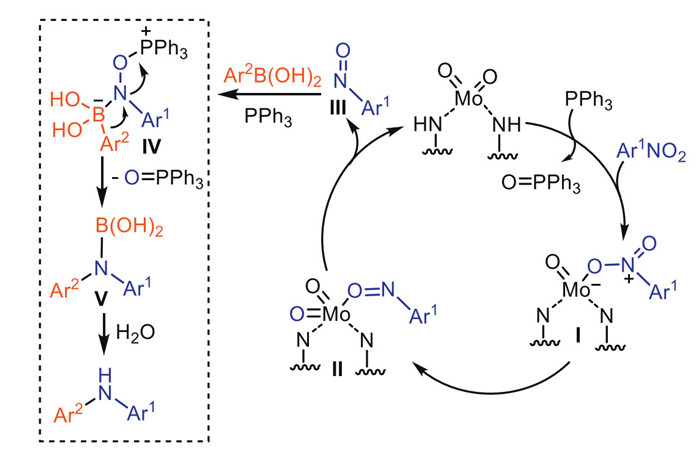 On the basis of presented above and precedent reports [17,19], a tentative reaction mechanism for direct amination of nitro compound with arylboronic acid is outlined in Scheme 8. As is known, molybdenum(Ⅵ) can be easily reduced by PPh3 to generate Mo(Ⅳ), which can coordinate with nitro compound to provide intermediate Ⅰ. Next, the re-oxidation of Mo center by coordinated nitroarenes produces intermediate Ⅱ with nitroso ligand. Intermediate Ⅱ releases free nitroso compound Ⅲ, accompanied by the regeneration of the original catalyst. Subsequently, nitroso compound Ⅲ interacted both with Ar2B(OH)2 and PPh3 to afford nitrenoid borate intermediate Ⅳ. Later, 1,2-migration of a nucleophilic Ar2 group to adjacent N center and spontaneous release of O=PPh3 leads to the formation the aminoboronic acid Ⅴ. Finaly, a diarylamine product was obtained by hydrolysis.