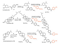 The late-stage modification of bioactive molecules has become a powerful and effective tool for quickly discovering new drug candidates. To showcase the applicability of the present method to late-stage synthesis, a variety of bioactive molecules were surveyed (Scheme 5). For example, dl-menthol (5), cholesterol (9), and dehydroabietylamine (12) reacted with 4-nitrobenzoyl chloride (6) to give intermediates 7, 10 and 13, respectively, which were reacted with 4-methyl phenylboronic acid under standard conditions to provide the target products 8, 11 and 14 in 72%, 71% and 78% yields.